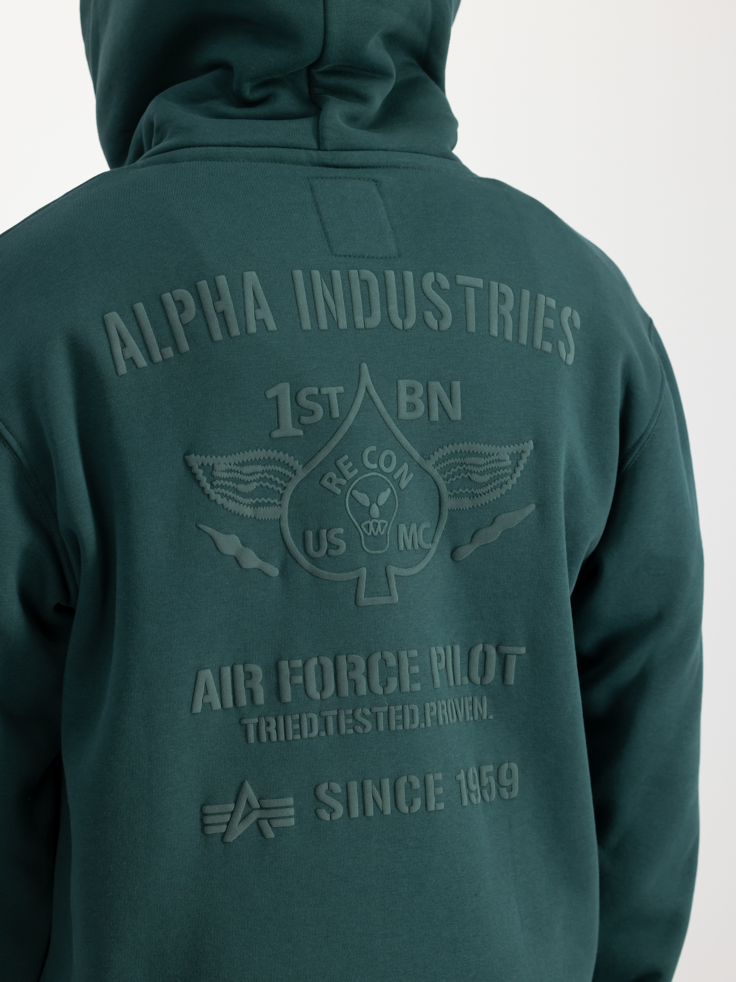 Din nye favorittgenser har flere unike trekk som skiller den ut fra resten. På venstre bryst finner du det ikoniske Alpha Industries-logoet - et kjennetegn på ekte kvalitet og stil. Vend litt på hoodyen, og du vil se det store 3D-Air Force-designet på ryggen. Dette gir hettegenseren et kult, moderne utseende samtidig som det gir en hyllest til merkets militære røtter.